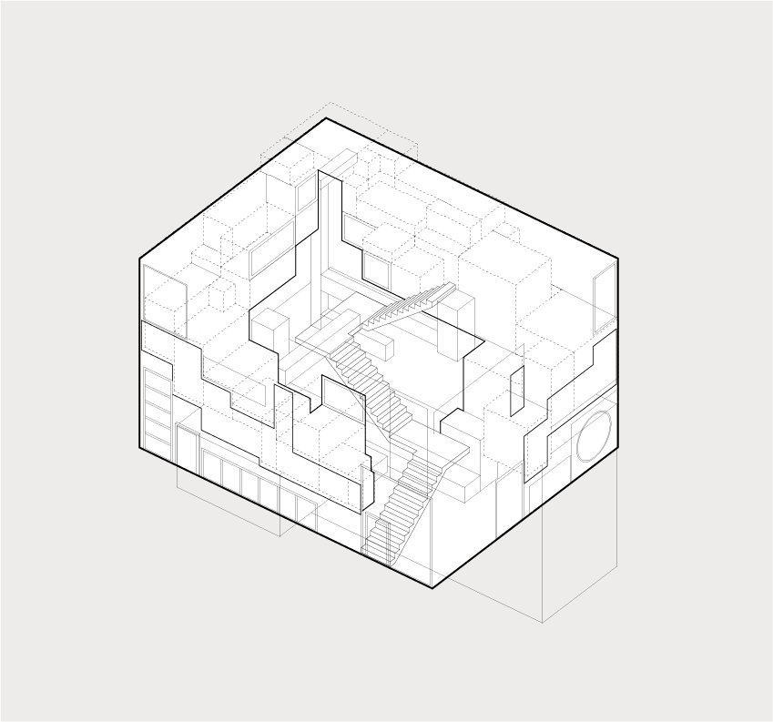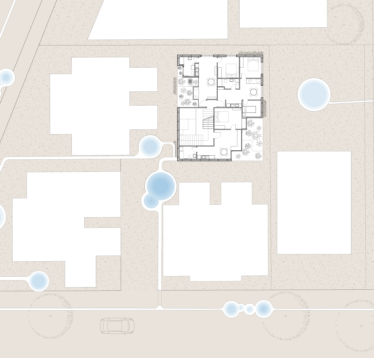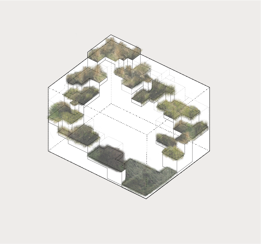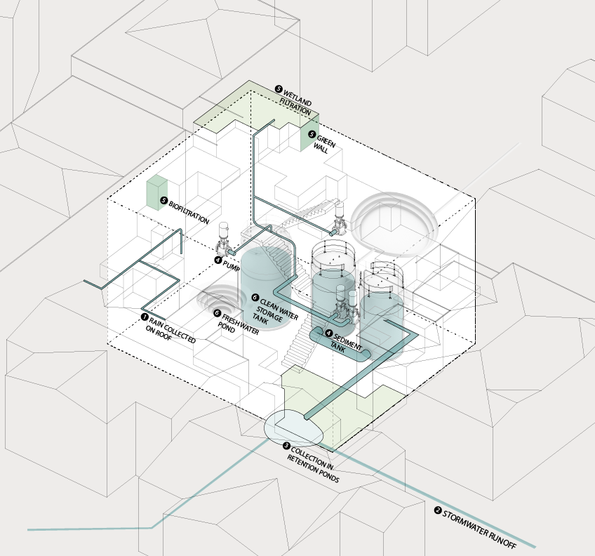 The scheme introduces a cellular urban fabric, where residential blocks are reimagined as hydrological units. These "cells" incorporate a network of water retention ponds that channel stormwater runoff towards centralized "filtration buildings". These hybrid structures synthesize residential and ecological functions, integrating apartment living with constructed wetlands to create a new architectural typology that blurs the boundaries between interior and exterior environments.