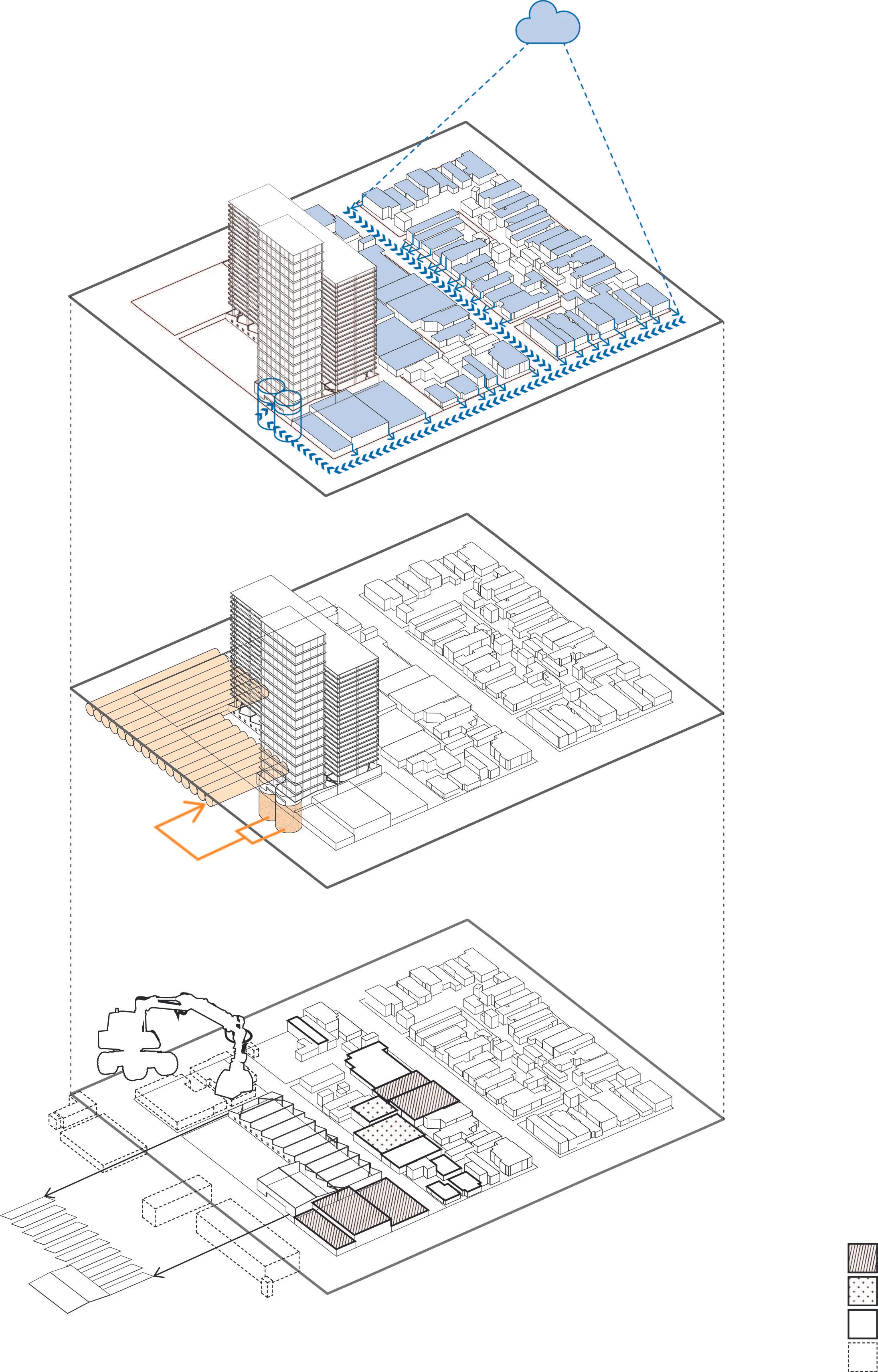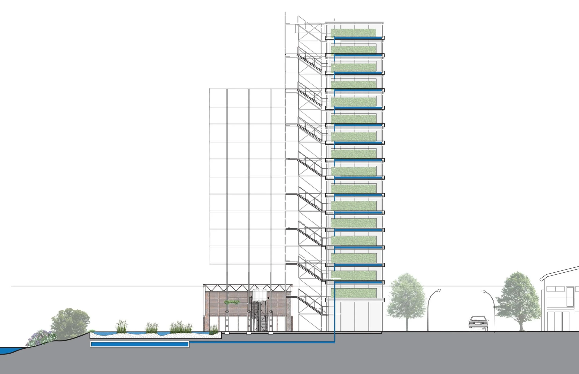 In light of the projected high-density development of Arden Macaulay industrial precinct, the Arden Spine offers a community-driven solution to the densification of a neighbourhood through a series of multi-purpose towers. Retaining the identity of the neighbourhood takes a high priority through the renovation of existing industrial buildings to address some of the water issues faced by current and future residents. Stormwater runoff is collected and treated to serve Arden food industry in the form of vertical farming towers constructed on renovated industrial buildings as their base level.